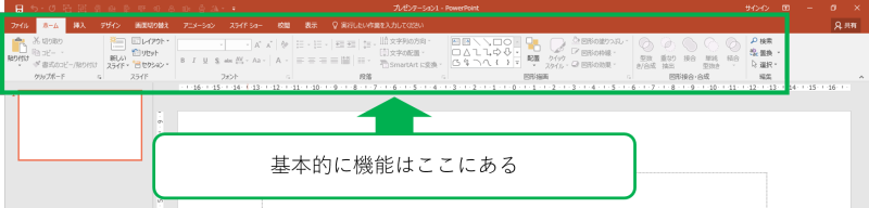 Officeのパワーポイントは、機能ツールがリボン1つですが